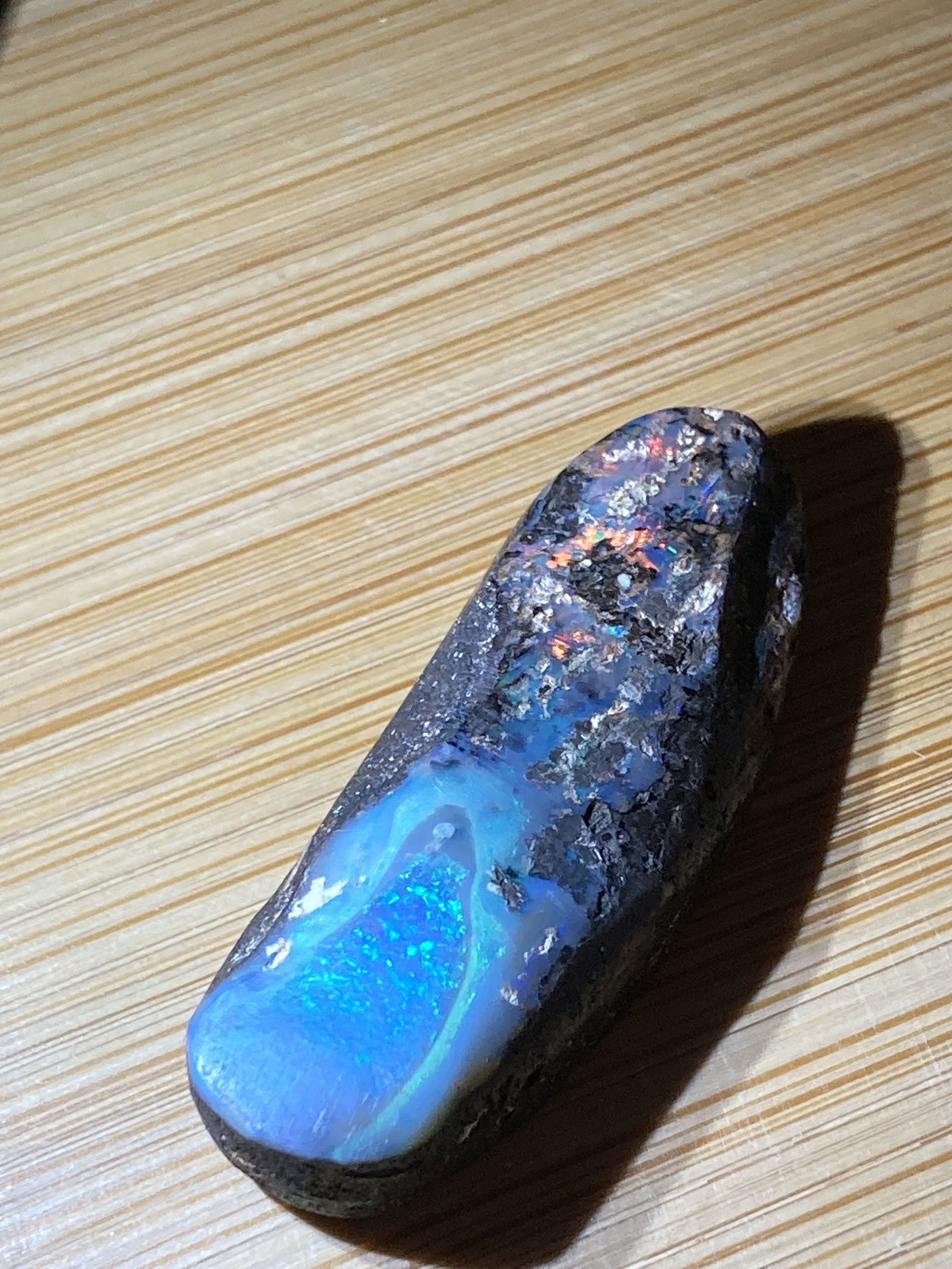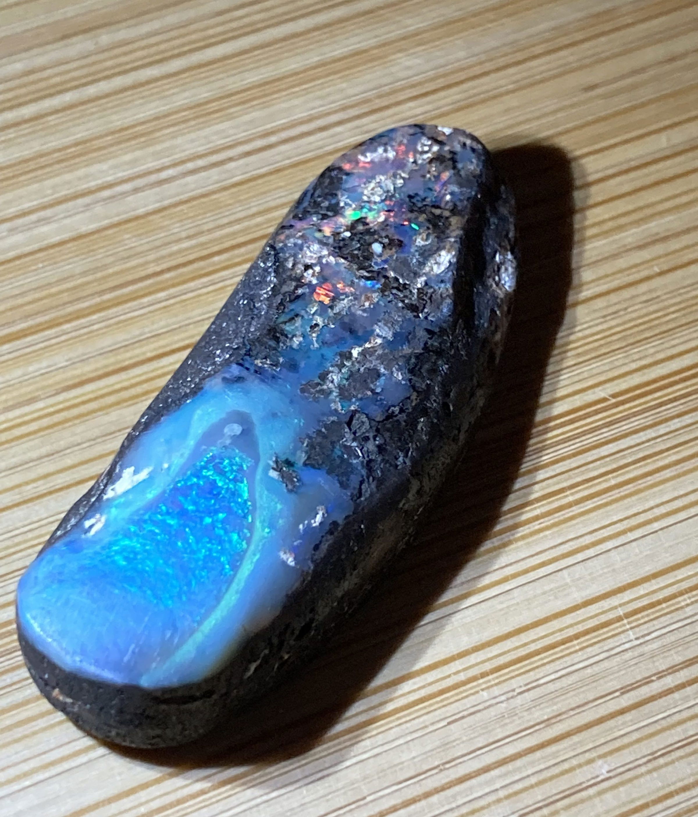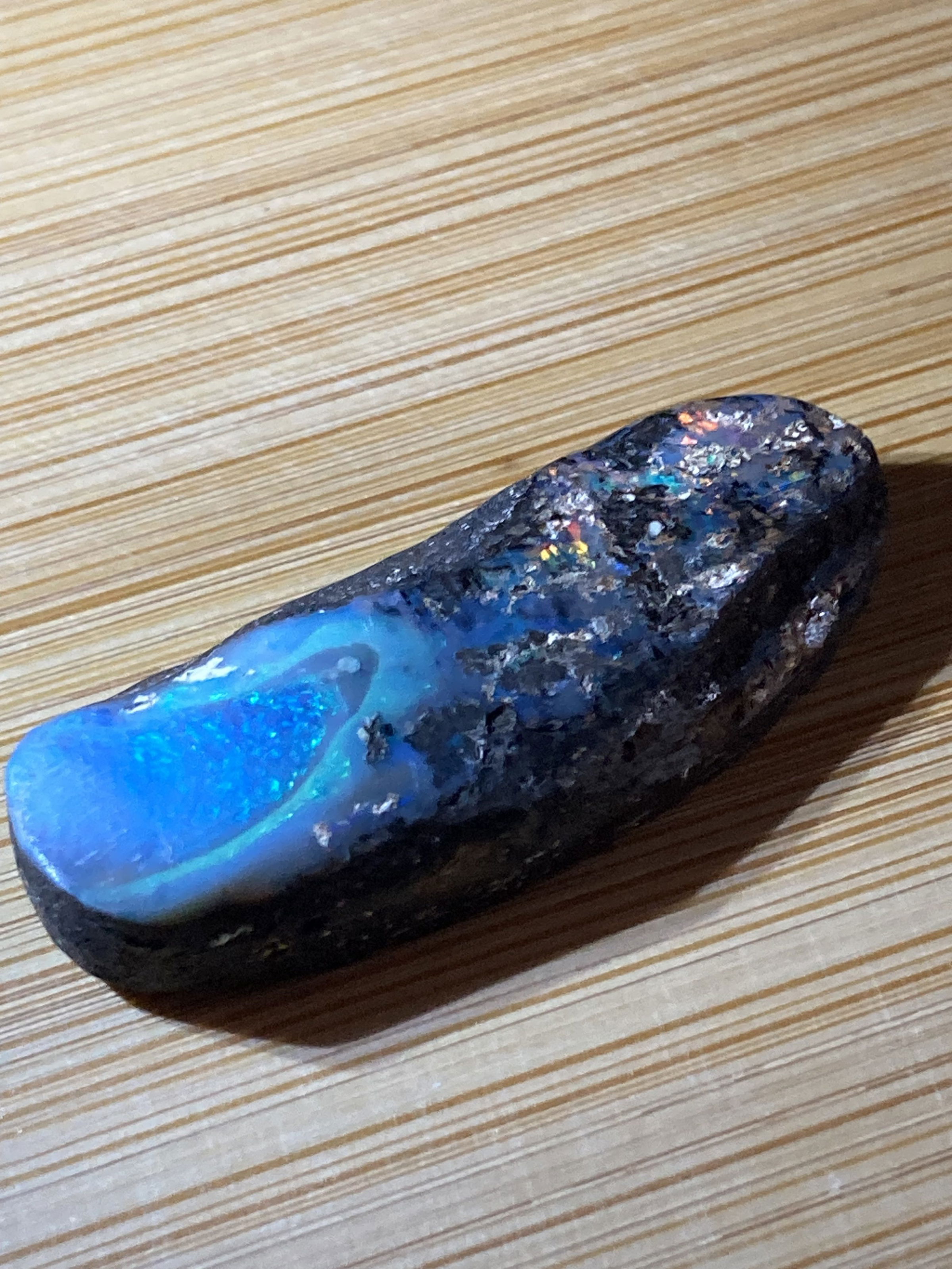 A stunning  Boulder opal 42 ct with blue and full color inclusions.Dimensions are 4 x1.5  0.8 cm thick.