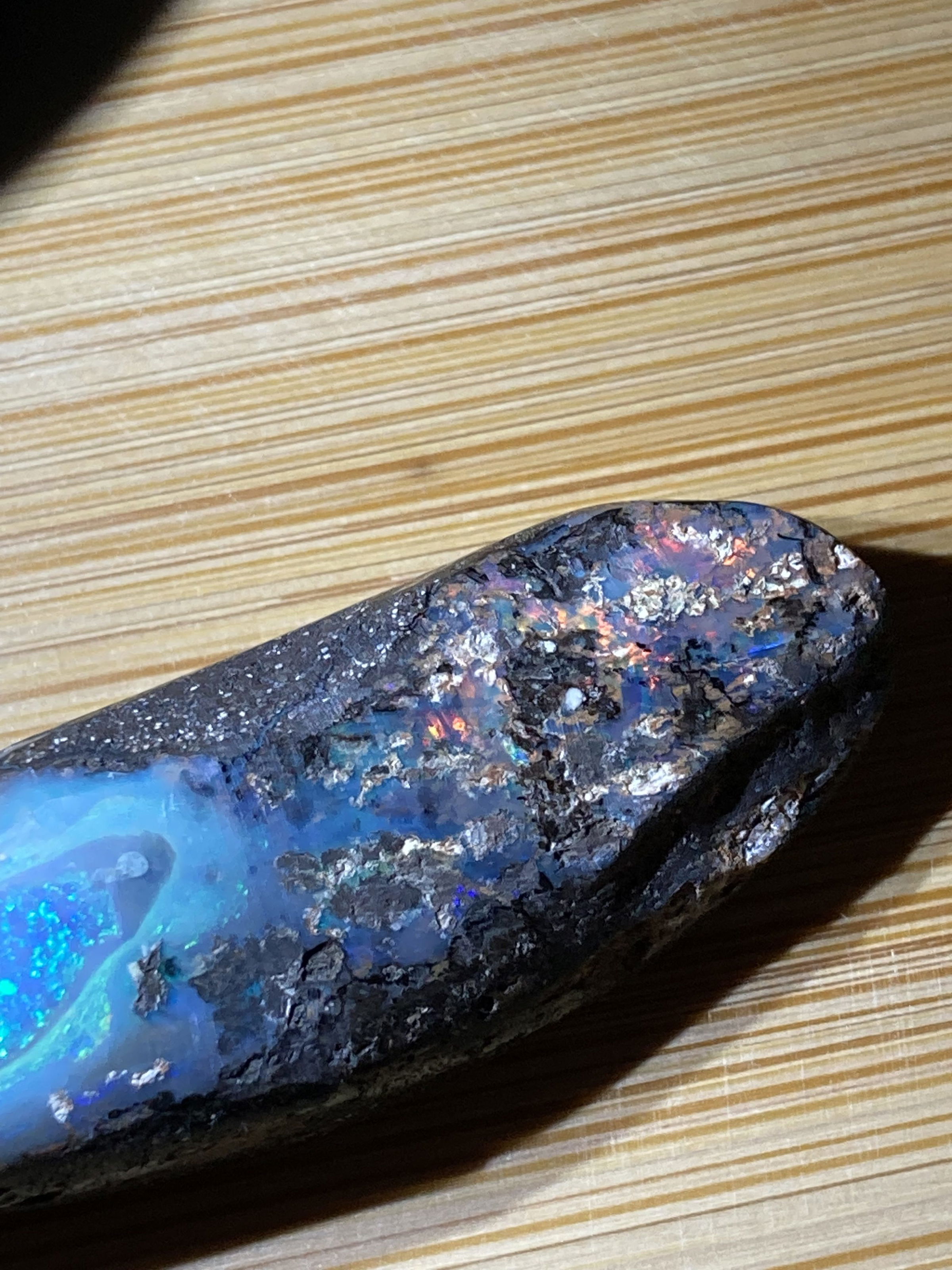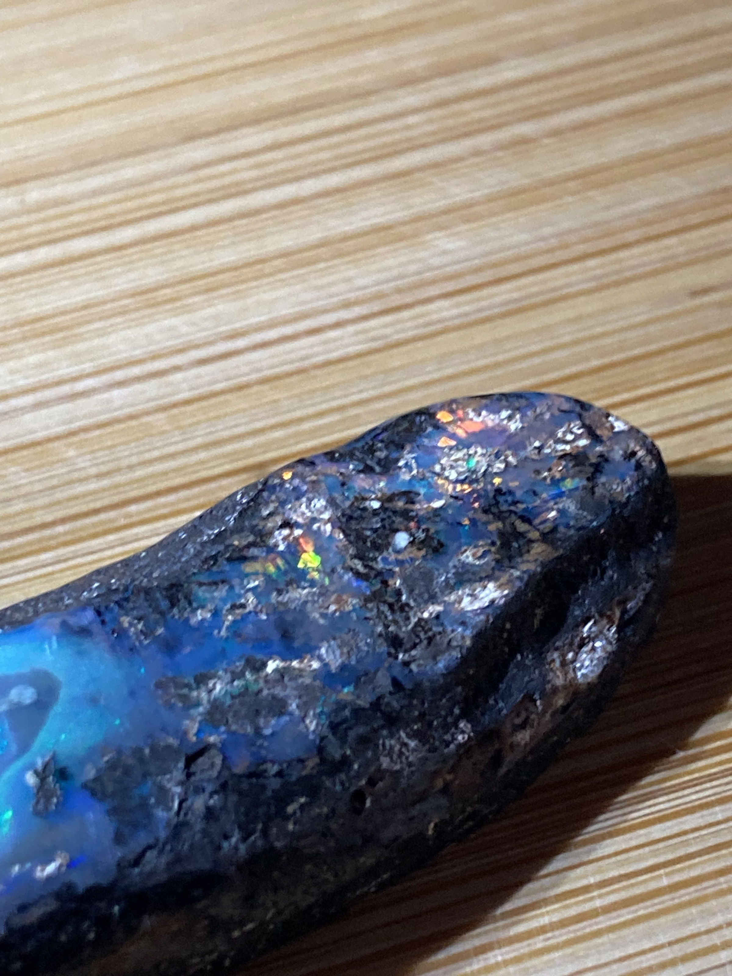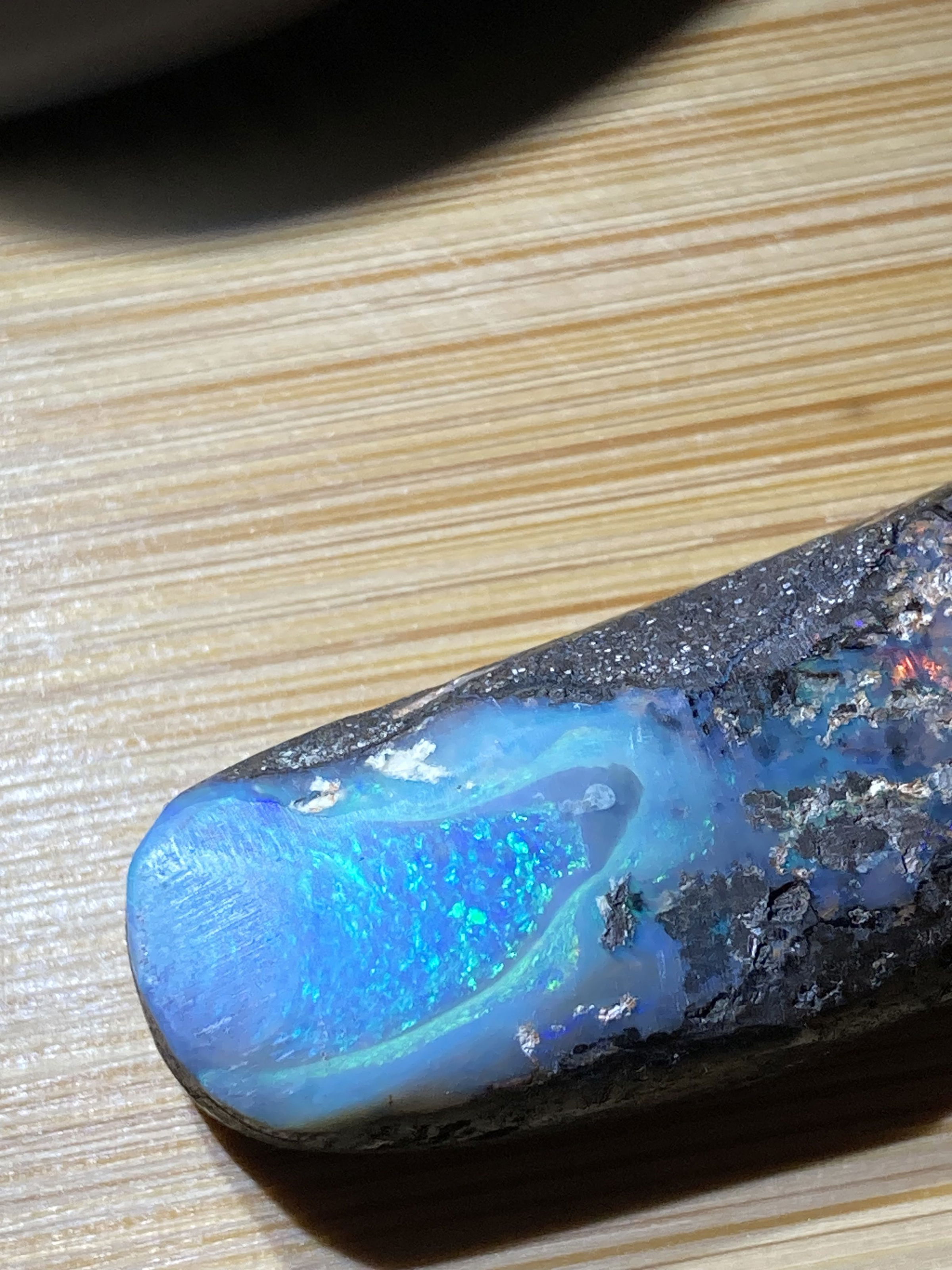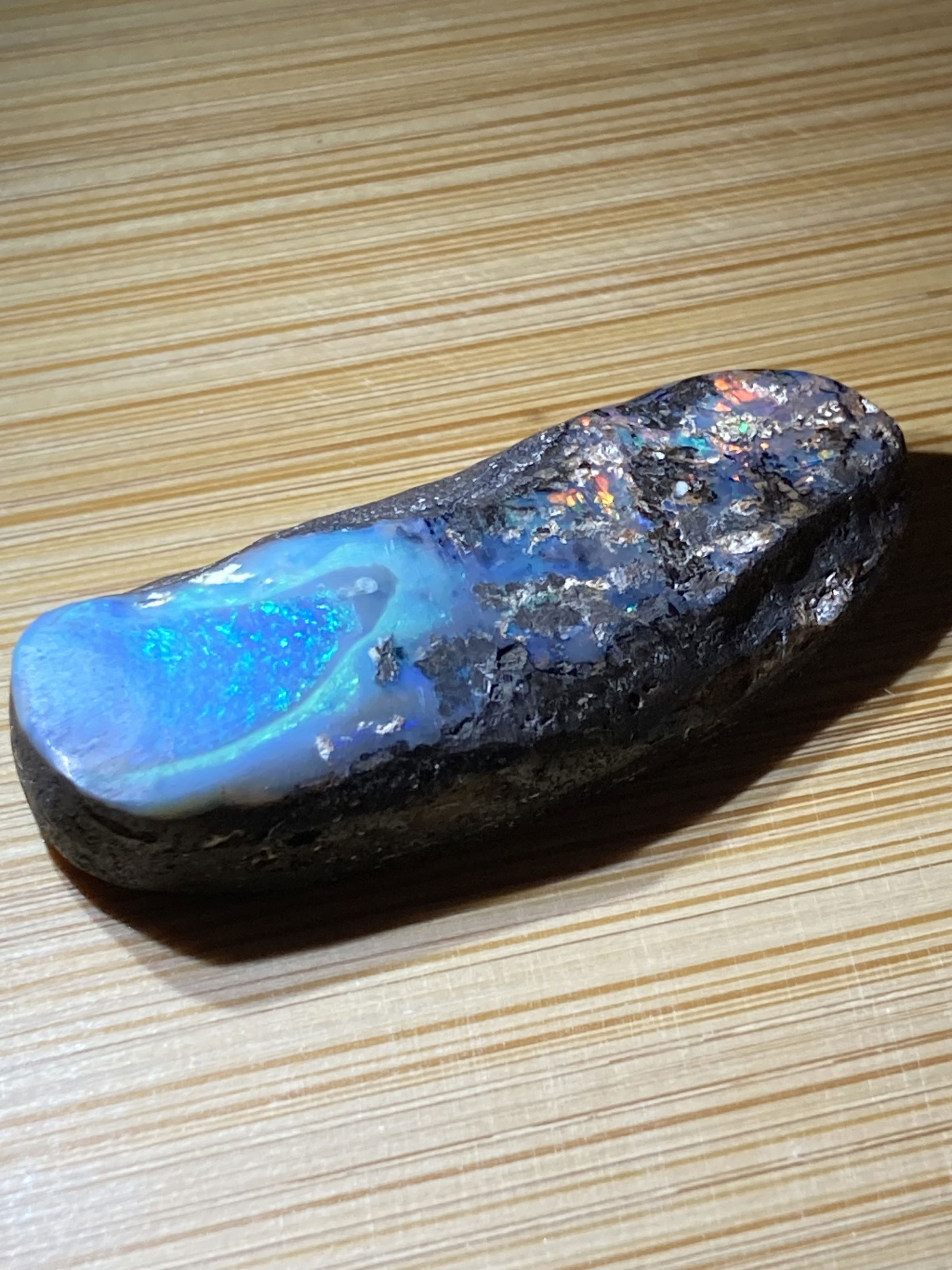 A stunning  Boulder opal 42 ct with blue and full color inclusions.Dimensions are 4 x1.5  0.8 cm thick.